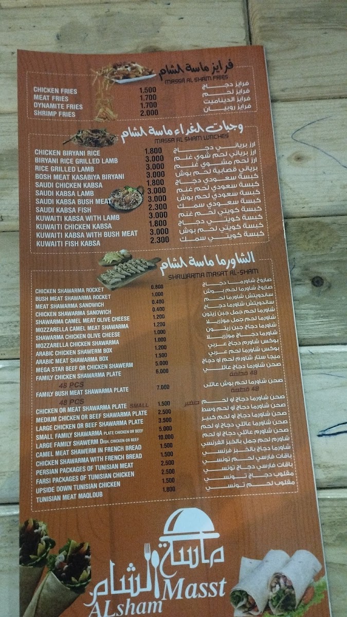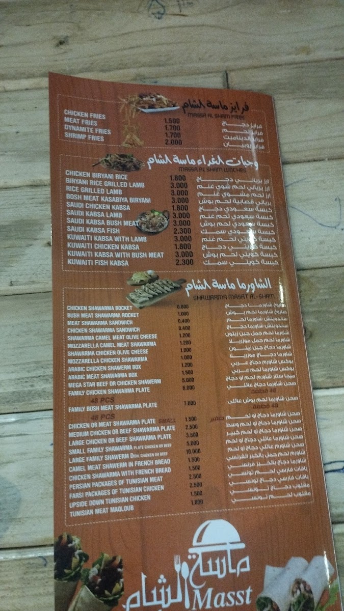 The menu at Masat Al Sham offers a delightful array of traditional dishes that cater to a variety of tastes. The star of the show is undoubtedly their Chicken, which is expertly seasoned and grilled to perfection, a must-try for any poultry lover. Another fan favorite is the Box Shawarma, a convenient and flavorful option for those on the go, packed with tender slices of meat, vegetables, and sauces. For those seeking a meatless option, the فلافل (Falafel) is a crispy, savory treat that pairs wonderfully with a side of hummus or tahini.